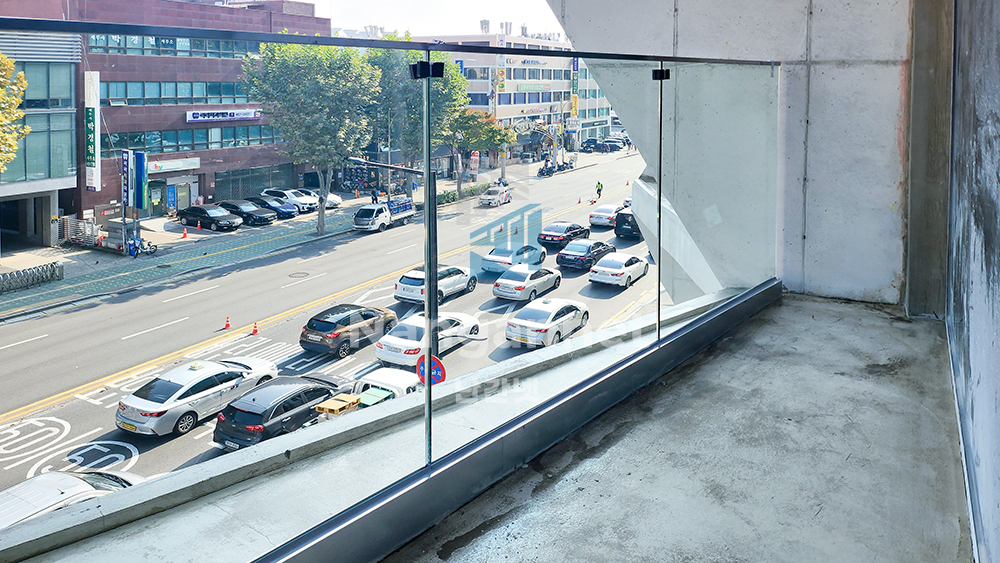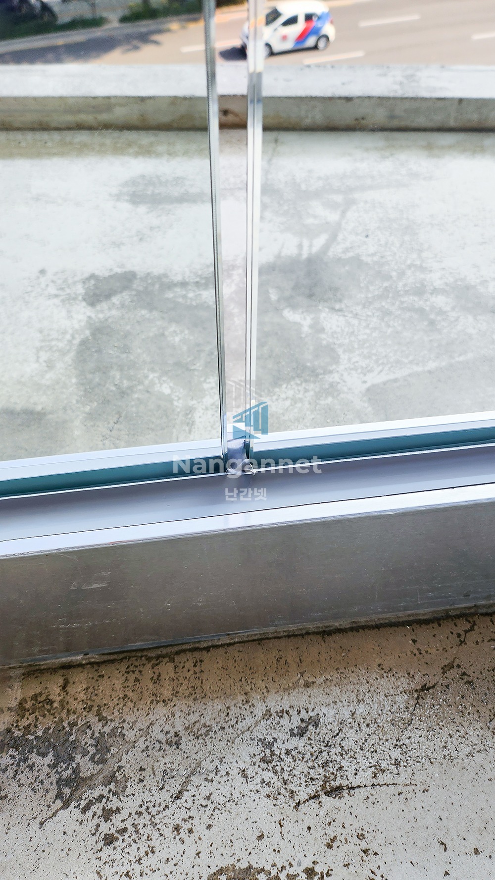 유리난간의 기둥이 20 * 60mm의 스테인레스 각기둥으로 되어있는 난간대입니다.